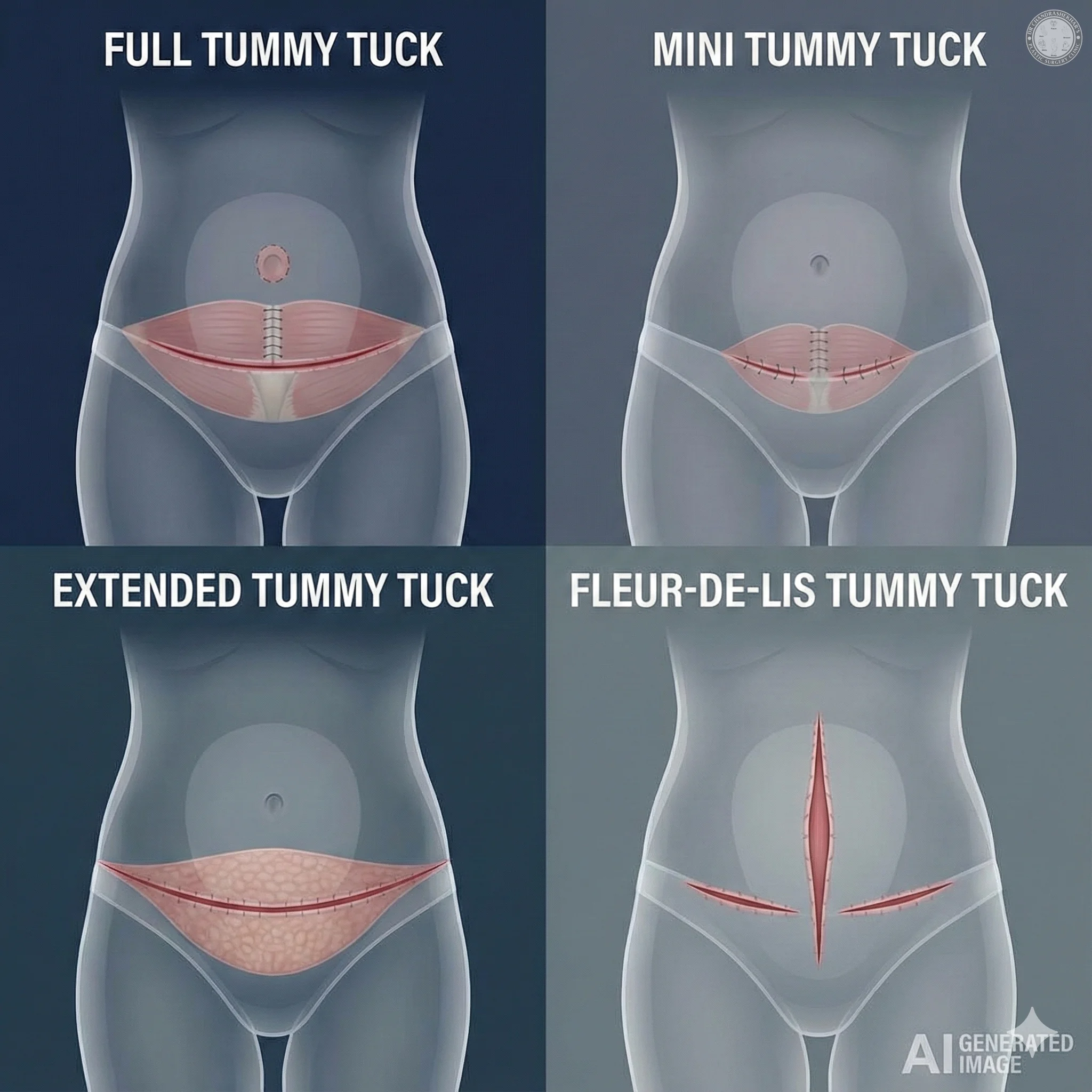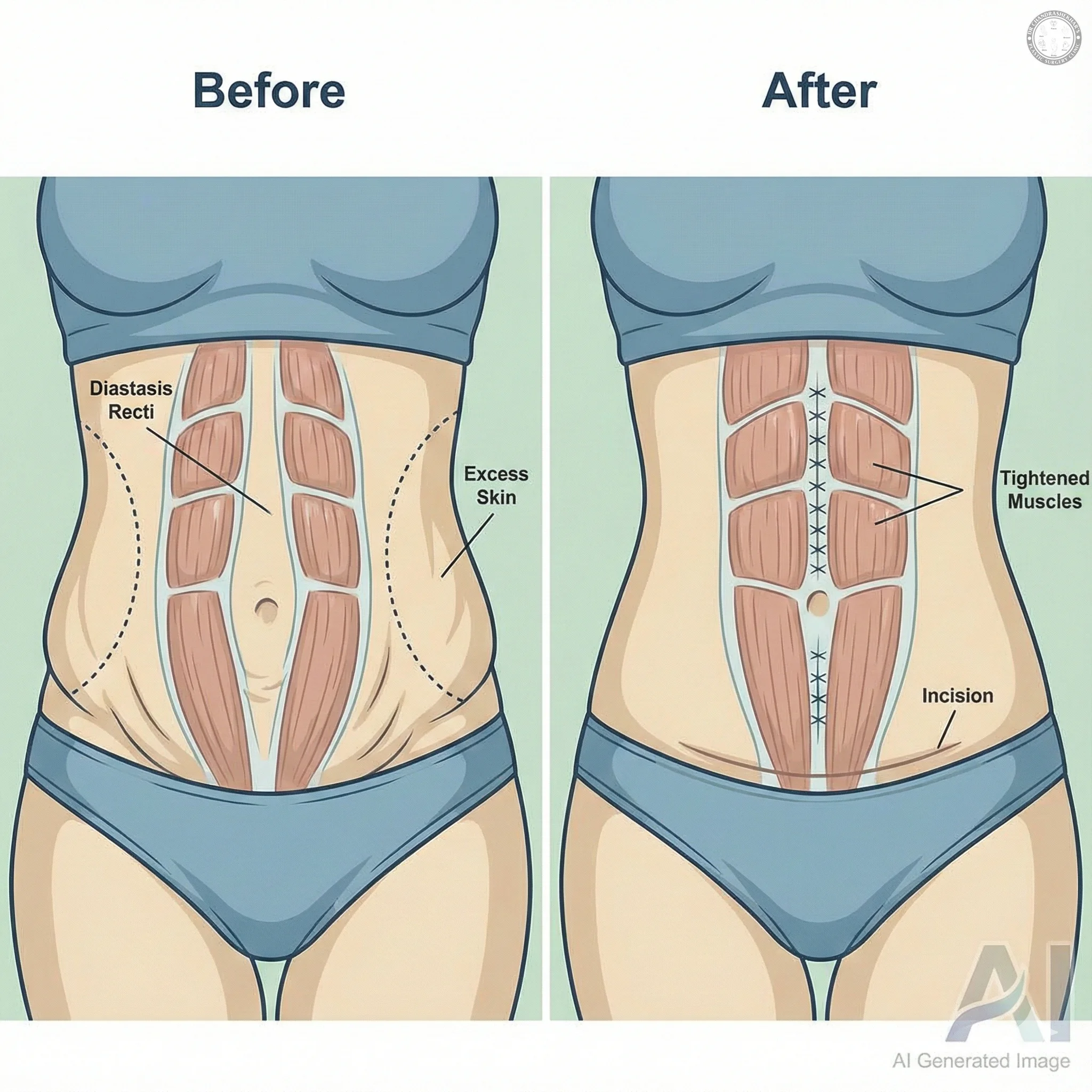 A tummy tuck removes excess abdominal skin and fat and tightens weak or separated muscles. It improves tummy shape but is not a weight-loss surgery.